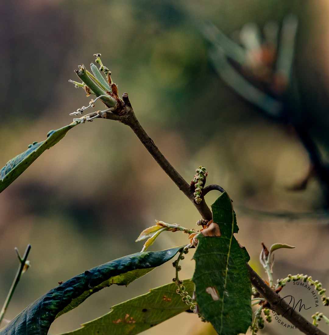 While the female flowers are somewhat hidden near the base of emerging leaves resembling as that of leaf buds and can viewed better under magnifying glasses. The male flowers produce pollen, while the female flowers produce eggs that will be fertilized once the flowers are pollinated. The pollens sometimes cause allergy during the blooming season. The flowers of Oak tree are mainly wind pollinated, although I have observed honey bees hovering on the Oak tree flowers. Also, I have observed sunbirds, blue whistling thrush, woodpeckers, Langoors and monkeys near new leaves (purplish brown colour) and flowers of the Oak trees. Proper studies should be done to have better understanding of pollination ecology and behaviour of Oak trees.
