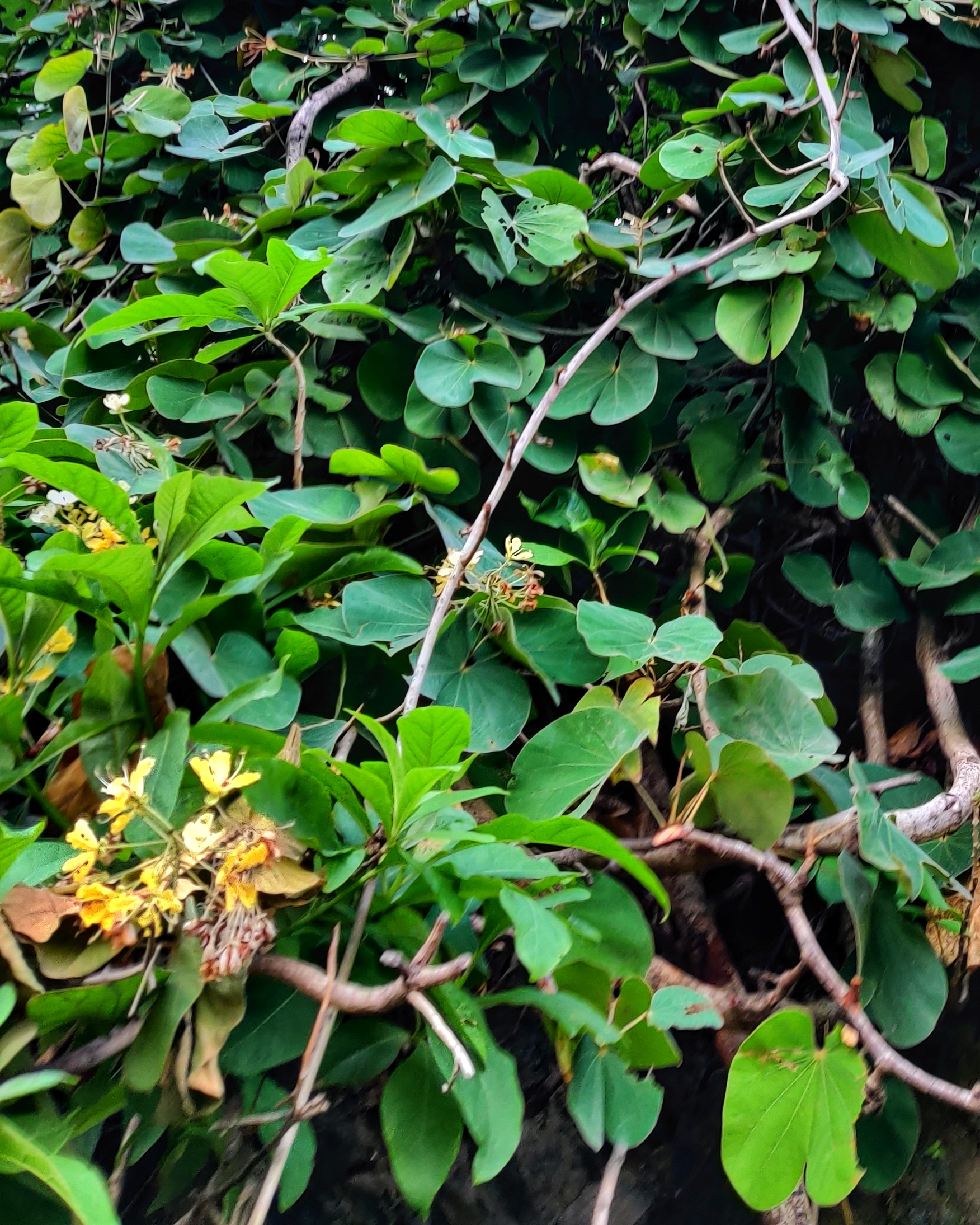 Eventhough, Maloo climber is considered as a problematic species with respect to the overall well-being of trees, this plant has multiple uses. The seeds, leaves, pod and flowers are the edible. The seeds of the plant are aphrodisiac can be eaten raw or fried and cooked as a pulse. The leaves are mucilaginous and have antiinflammatory properties. The leaves protect soil from erosion are also used for thatching, making plates, cups etc . The fibrous inner bark is used in making ropes. The stems are used for basketry, matting, and wickerwork.