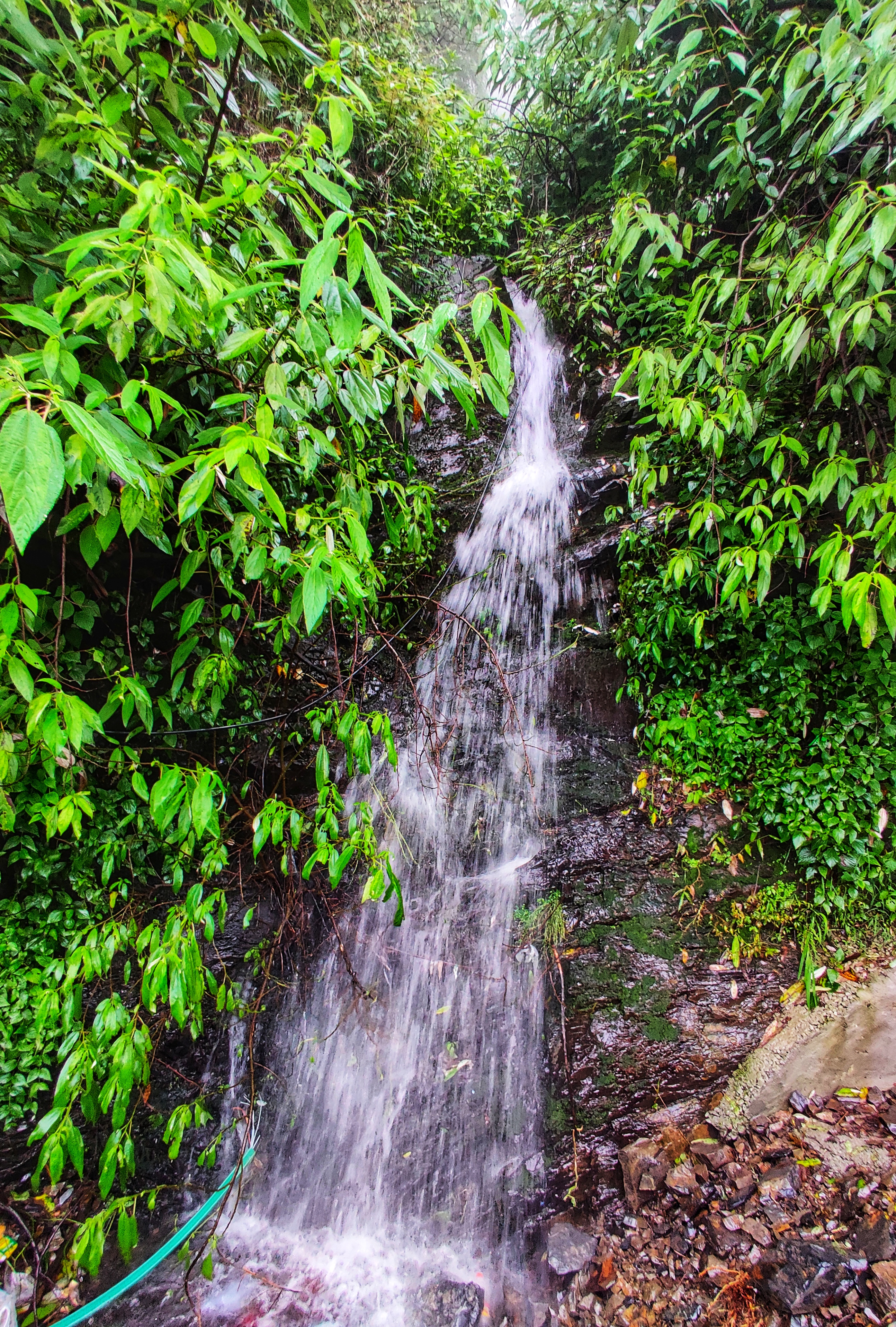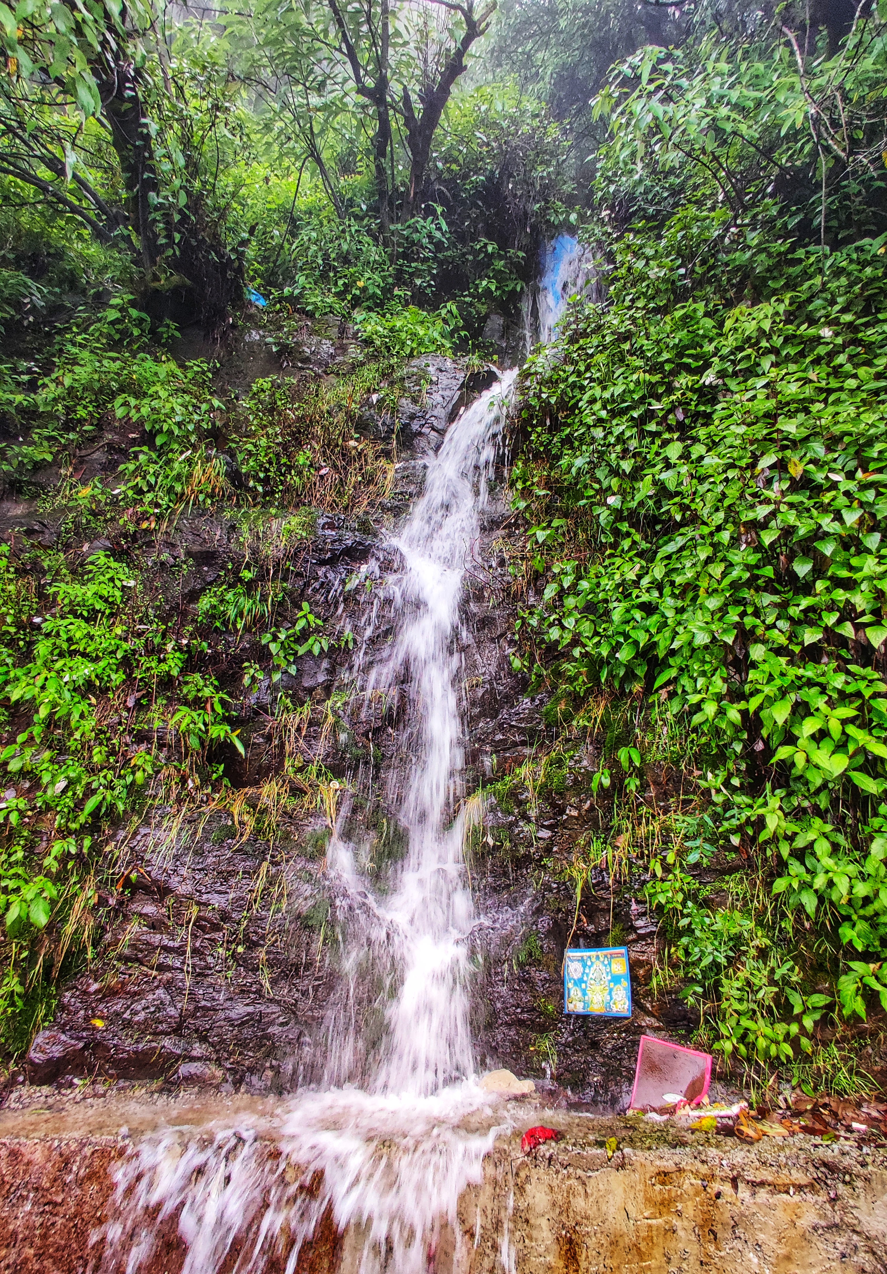On the way I came across few streams which have sprung up due to heavy rains. Often these streams are near dry during winters and mid summer, but this year the creek was running strong from all the rain it had. It was a pleasant experience to hike along listening to the running water although one has to be careful enough with the approaching vehicles. I stepped ahead and found few more streams on the roadside. The rainwater flows through the roads and channels finally culminating into main channel and then drains through the hillslopes sometimes giving expression for pseudo waterfall. I won’t recommend it for drinking purpose. However, the local people around the area use the streamwater to wash clothes, clean vehicles etc. I often observed tourists sometimes stopby these streams and take shower. Also, few pictures of gods and goddesses also lie nonchalant in the catchment.