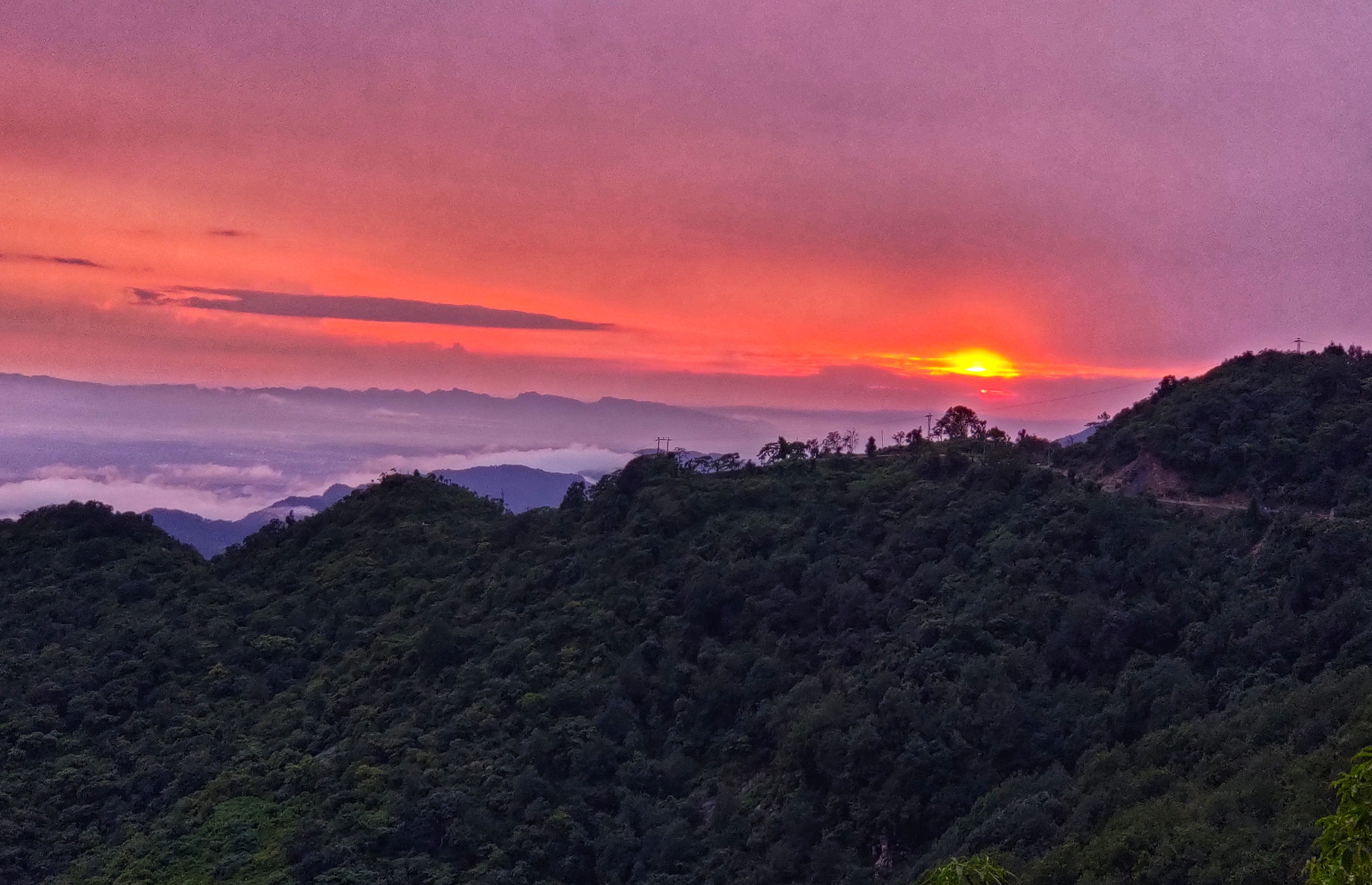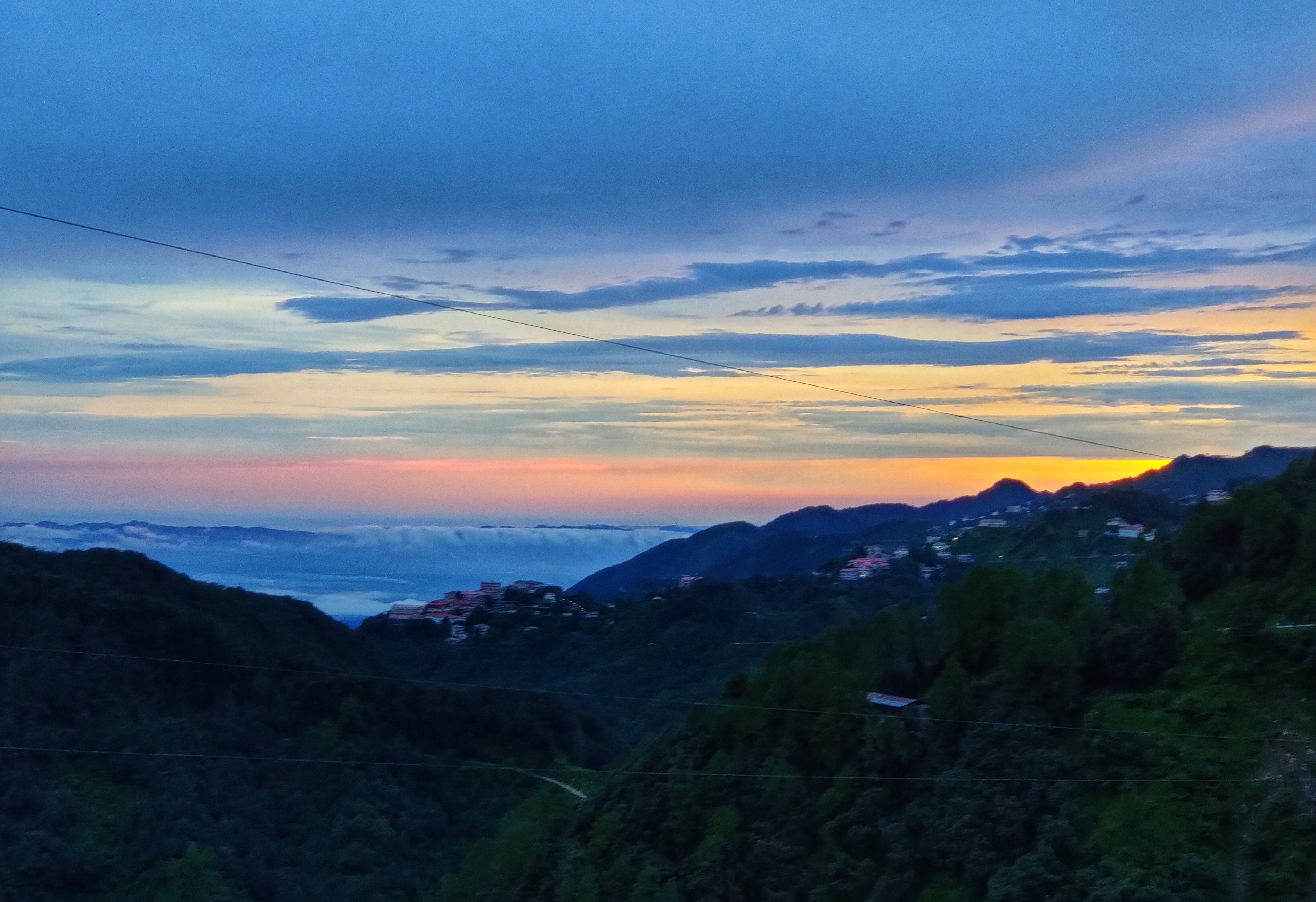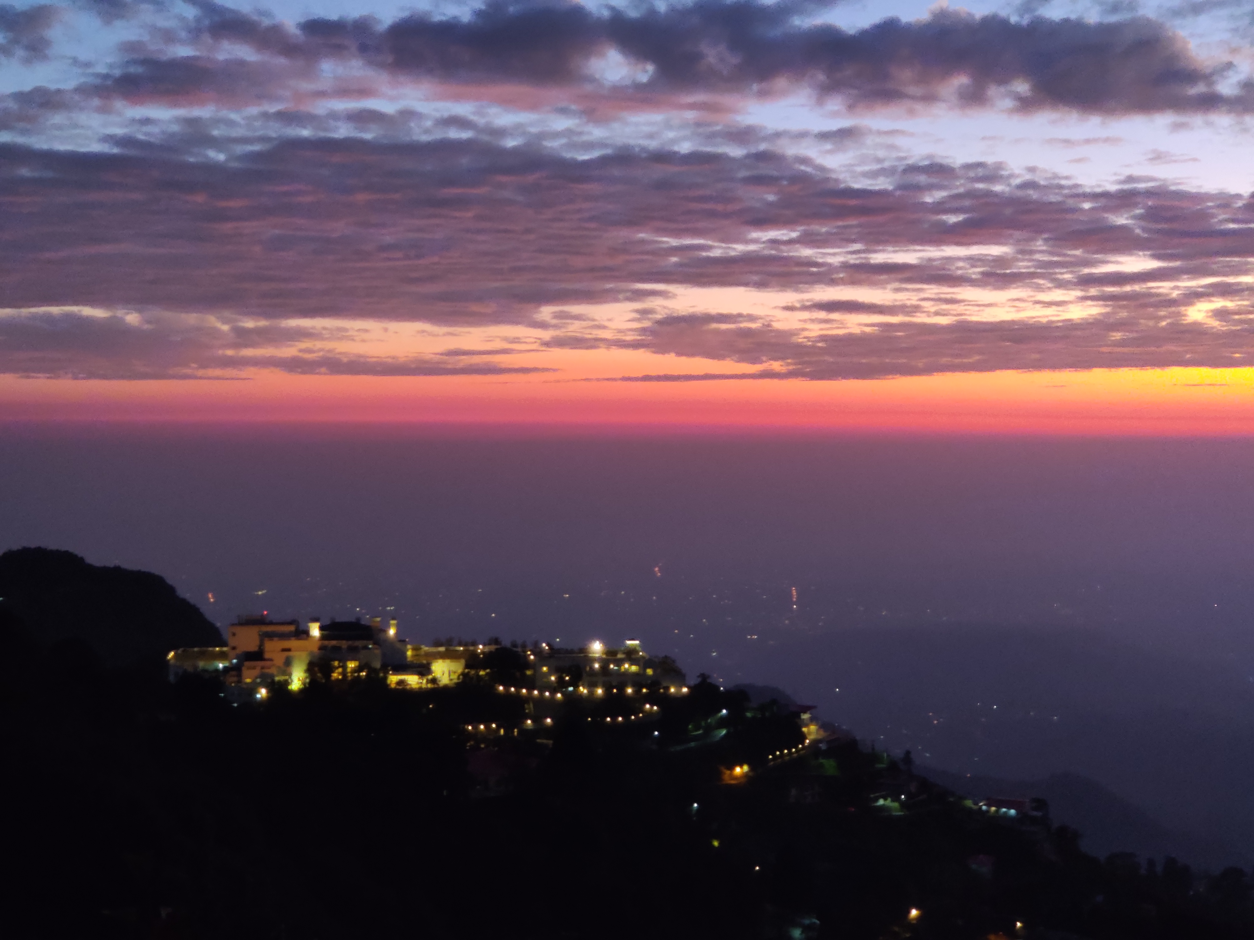 The scintillating canvas of sky was displaying multitude hues of yellow, orange, red, mauve blue and grey. This meteorological phenomena sparked up the artistic orchestration of vivid shades and colours in the playground of sky. The shimmering sunrays spread golden hues in the Himalayas.