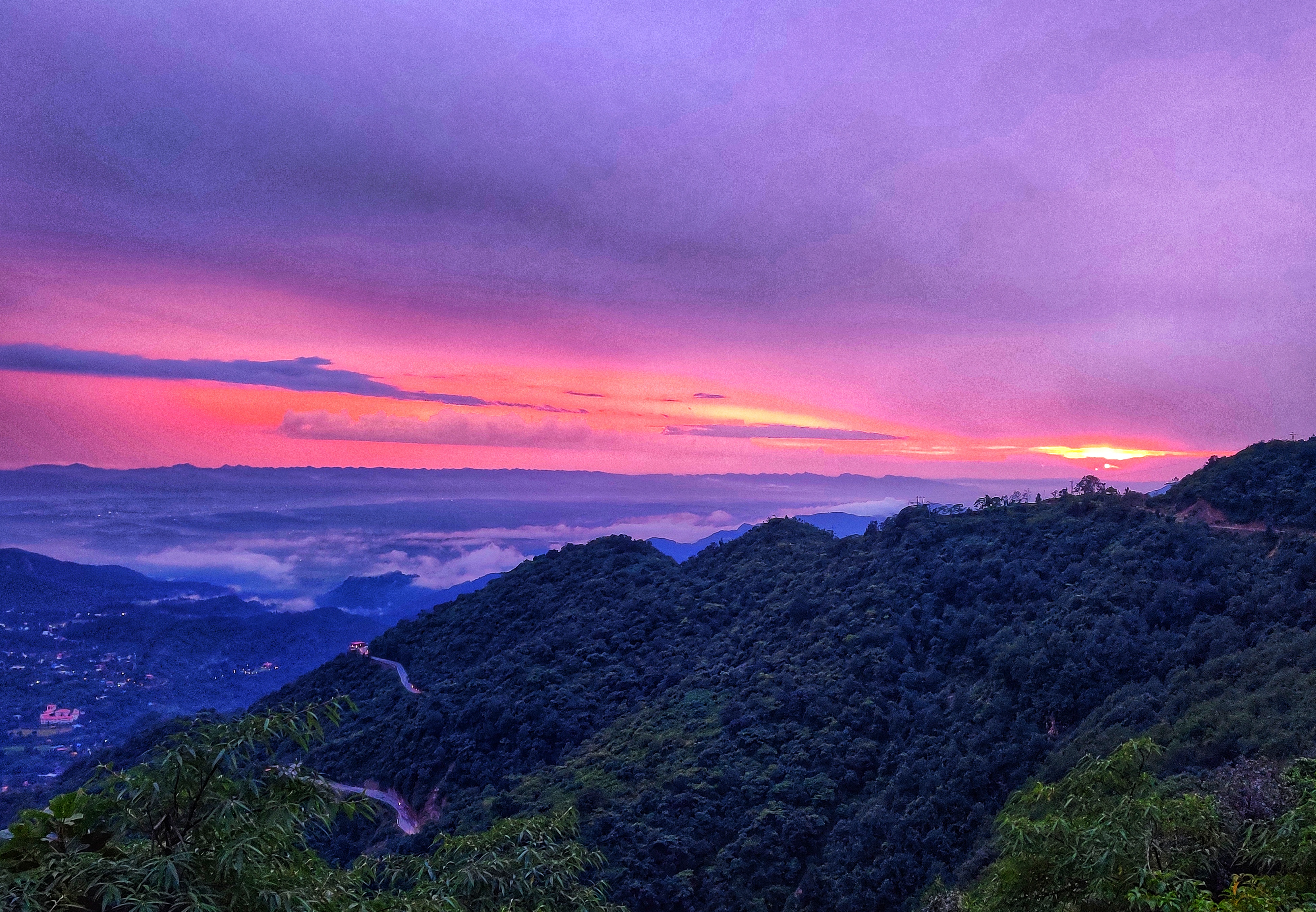During sunset the sunrays refract through the moisture, dust particles and other particulates in the atmosphere and create a mesmerizing meteorological phenomena known as Winterline. It is visible from Mussoorie in India between October and February. Besides Mussoorie, India this winterline also occurs in the Swiss Alps, Europe. However, during recent years, high air pollution levels have affected the prominence of Winterline.