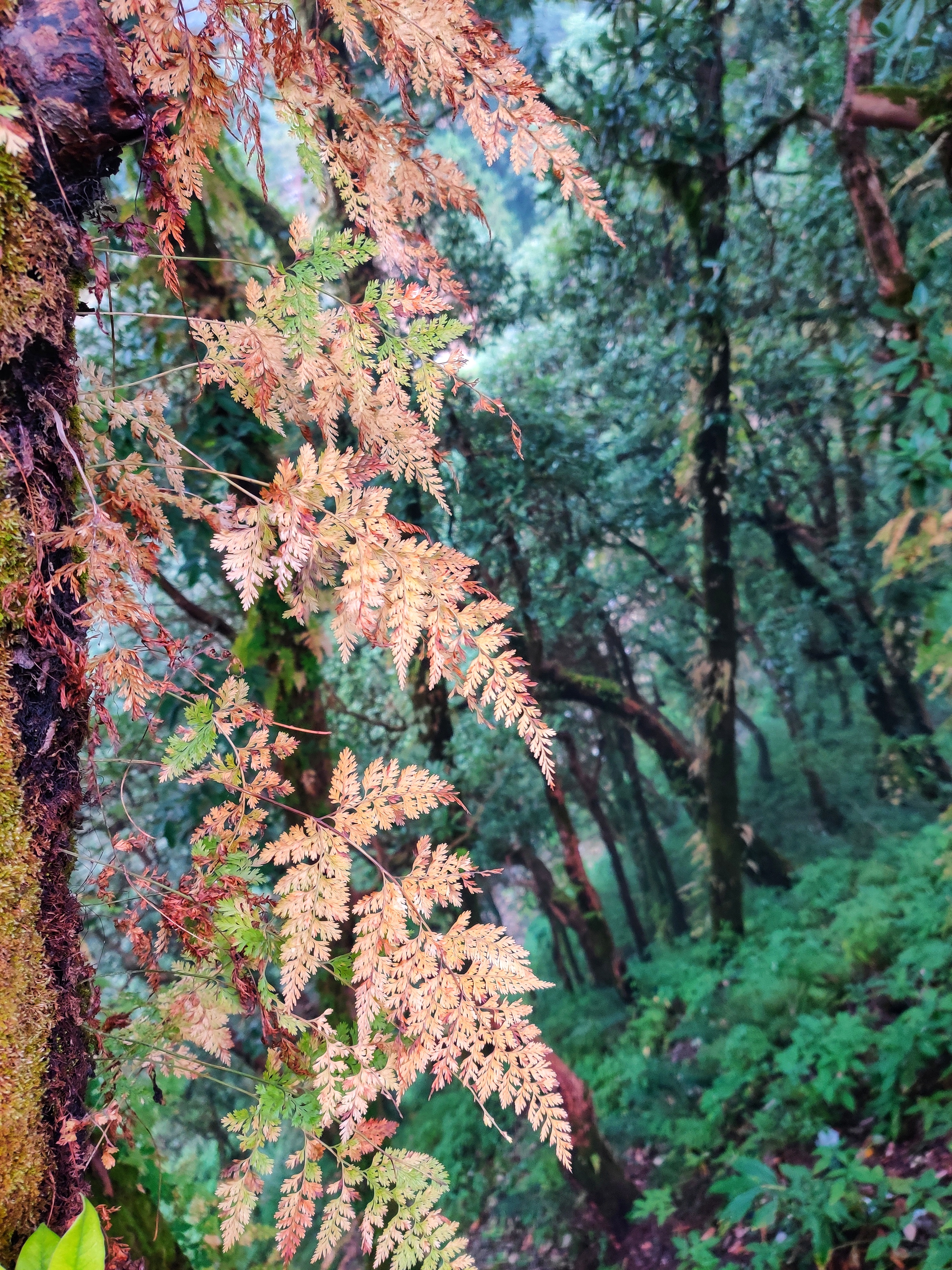 With the onset of winters, the ferns have turned brown in the lesser Himalayas. The winter Himalayan breeze blowing through the mixed forests of Oak- Pine and Rhododendron signals the arrival of winters to the ferns, which grow alongside the moss laden tree barks and hillslopes of this quiet hillside of Landour, Mussoorie. With the first touch of the cold Himalayan breeze, the ferns begin to turn brown and slowly wither until the arrival of next spring-monsoon.