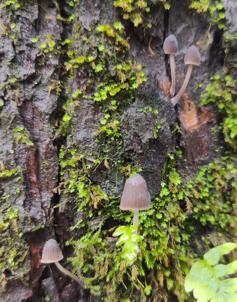 The mushroom in the above picture belongs to the Mycena genus It is a large genus of small saprotrophic mushrooms that are rarely more than a few centimeters in width. They are characterized by a white spore print, a small conical or bell-shaped cap, and a thin fragile stem. Most are gray or brown.