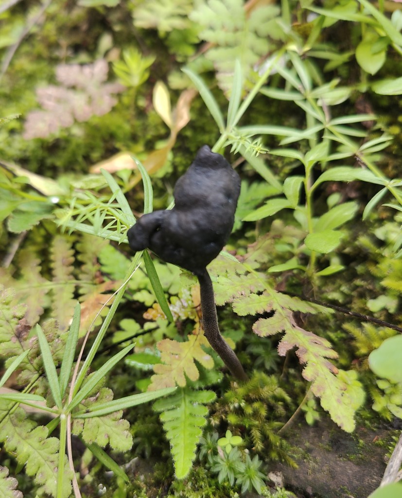 I was startled by the view of this black mushroom growing on the forest slope near Rhododendron trees. At first it gave me the impression of a dead insect. This is Helvella lacunosa also known as the slate grey saddle or elfin saddle. This mushroom is considered edible by some although there are reports about the toxicity of this mushroom often leading to gastrointestinal disorders.