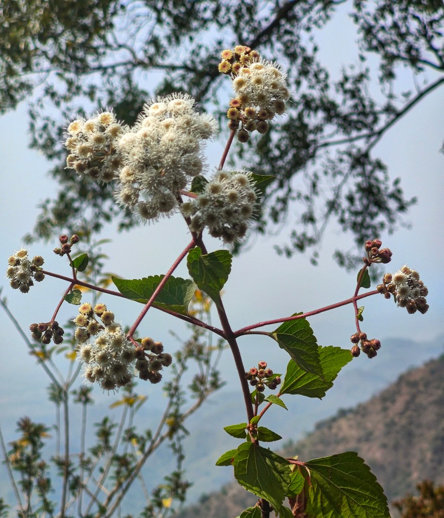 Mexican Devil (Ageratina adenophora synonym Eupatorium adenophorum), commonly known as Crofton weed, is a species of flowering plant in the family Asteraceae native to Mexico and Central America. Initially grown as an ornamental plant, it has now become invasive into forests, hillslopes, roadside and farmlands.